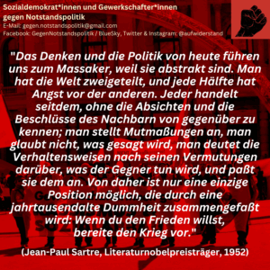 Die Genoss*innen von den Informations Ouvrières in Frankreich haben unseren Aktivisten Axel Magnus darum gebeten, ihnen einen kurzen Bericht über die Aktion gegen den Aufrüstungswahn am Nationalfeiertag und den vollkommen unbegründeten Polizeieinsatz gegen diese zukommen zu lassen, was er gerne getan habe. Hier könnt ihr diesen im Original nachlesen.